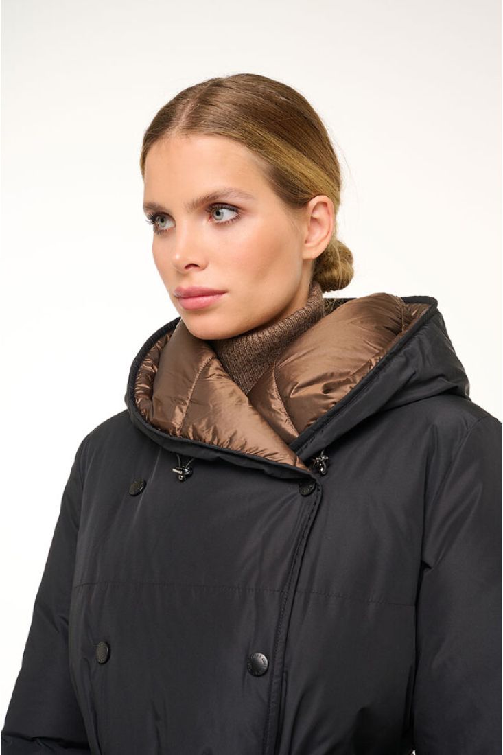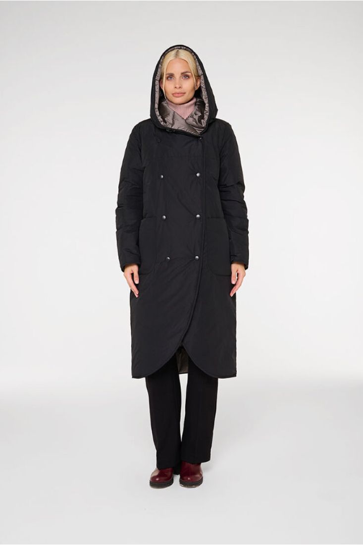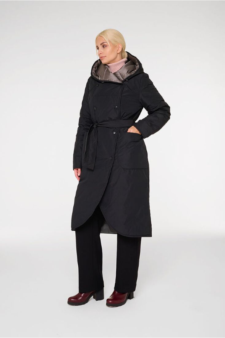 Мягкий овальный силуэт и скругленные полы этого пальто достойно сядет на пышные формы, но также сумеет подчеркнуть хрупкость. Двубортная застежка на кнопки придает пальто немного классической строгости, которую можно смягчить, подвязав пояс и сформировав женственную линию талии.